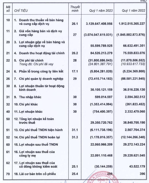 Do doanh thu giảm, lợi nhuận gộp quý I/2023 cũng chỉ đạt 42 tỷ đồng, giảm 20% so với cùng kỳ năm trước. Biên lợi nhuận gộp đạt 2,5%, giảm nhẹ so với cùng kỳ là 2,62%; riêng biên lợi nhuận gộp của mảng hoạt động xây dựng là 2,29%.