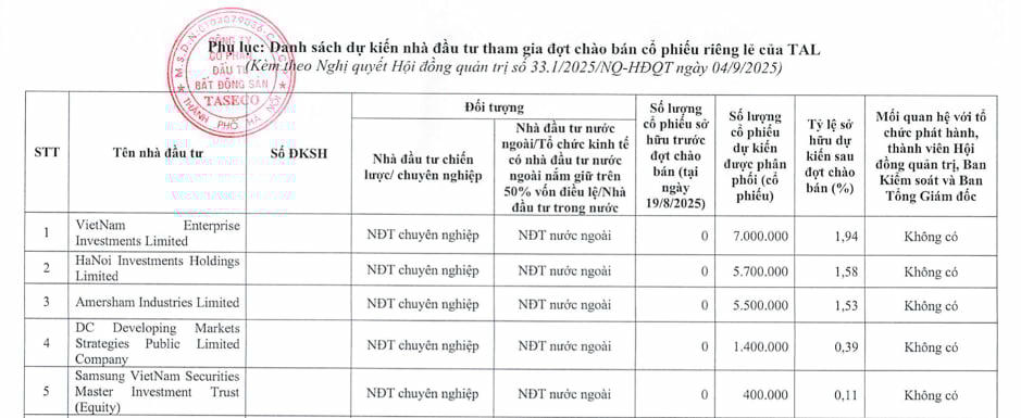 Đồng thời cũng công bố Nghị quyết HĐQT lựa chọn danh sách nhà đầu tư chứng khoán chuyên nghiệp. Theo Nghị quyết ĐHĐCĐ bất thường, Taseco Land thông qua phương án chào bán riêng lẻ 48,15 triệu cổ phiếu với giá 31.000 đồng/cổ phiếu, dự kiến huy động 1.492,65 tỷ đồng. Thặng dư vốn khoảng hơn 1000 tỷ đồng. Với tỷ lệ tán thành đạt trên 96%, cho thấy sự ủng hộ mạnh mẽ của cổ đông công ty đối với kế hoạch tăng vốn.