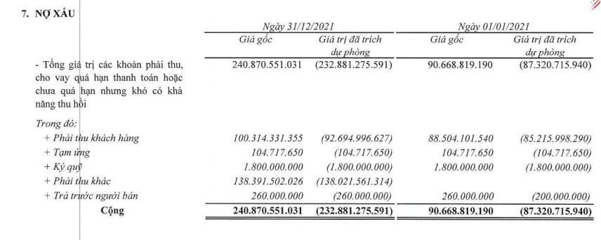 Lưu ý, tại ngày 31/12/2021, BCG còn khoản nợ xấu hơn 240 tỷ đồng, trong đó đã trích lập dự phòng gần 233 tỷ đồng. Khoản nợ xấu này xuất phát từ tổng giá trị các khoản phải thu, cho vay quá hạn thanh toán hoặc chưa quá hạn nhưng khó có khả năng thu hồi.