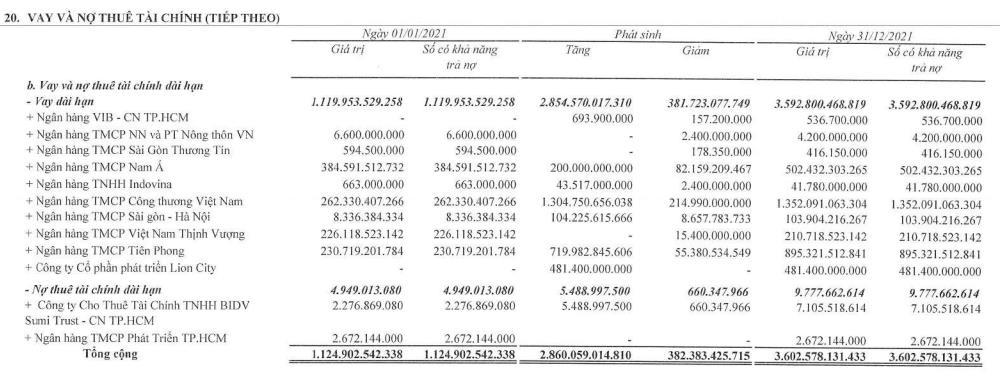 Nợ phải trả tăng mạnh chủ yếu do nợ dài hạn tăng đến 93% so với đầu năm, tương đương tăng gần 10.000 tỷ đồng lên xấp xỉ 20.375 tỷ đồng. Trong đó, đáng lưu ý chính là nợ vay tài chính dài hạn tăng đột biến 380%, từ 2.549 tỷ đồng lên 12.229 tỷ đồng.