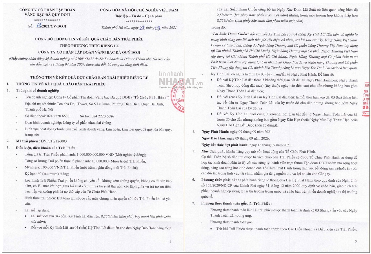 Theo thông tin từ Sở giao dịch chứng khoán Hà Nội (HNX), CTCP Tập đoàn Vàng bạc Đá quý DOJI vừa công bố kết quả phát hành 10 triệu trái phiếu với tổng trị giá 1.000 tỷ đồng. Mục đích chủ yếu của đợt phát hành này để đầu tư bất động sản.