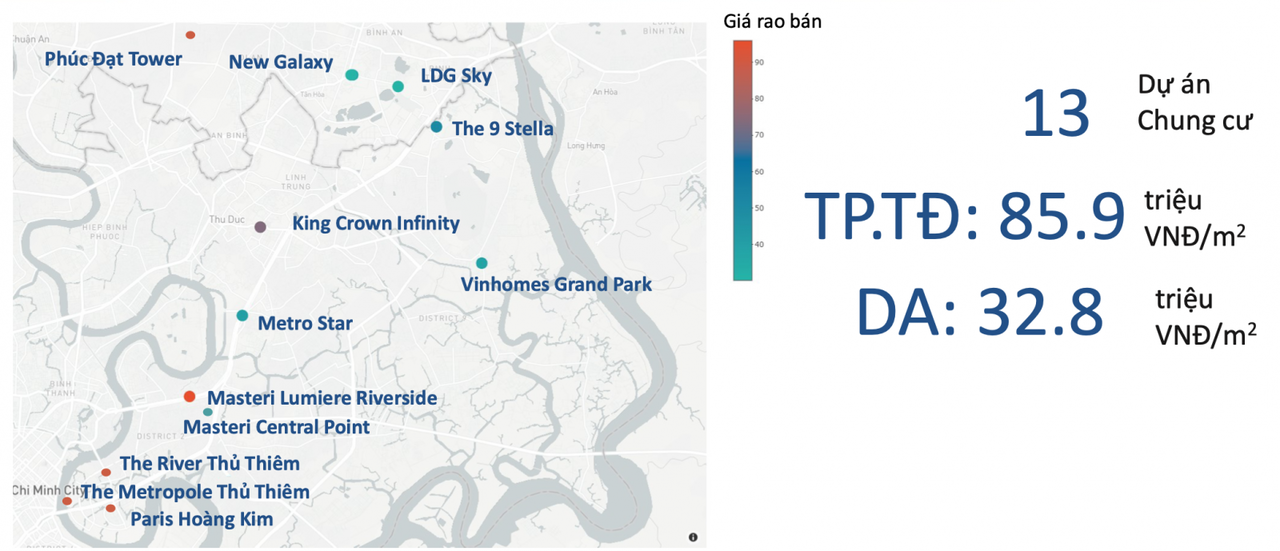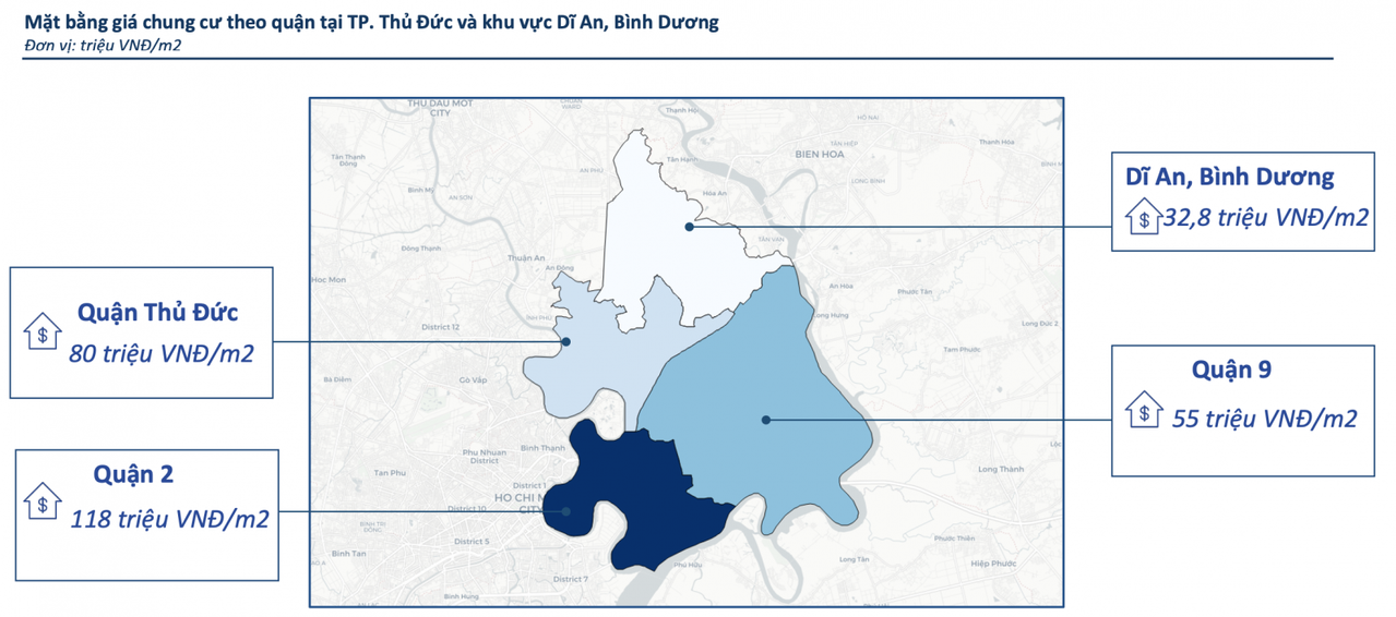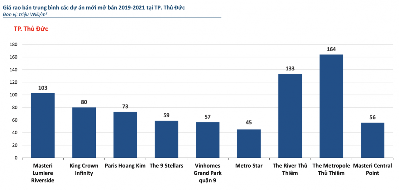 Việc thành lập thành phố Thủ Đức cùng với sự ủng hộ của cả hệ thống chính trị đã thúc đẩy làn sóng đầu tư mới của các doanh nghiệp và niềm tin của nhà đầu tư. Điều này đã góp phần đưa mức giá chào bán trung bình các dự án bất động sản mở bán gần đây lên 85,9 triệu đồng/m2. Tốc độ gia tăng giá bán căn hộ ở khu vực này cũng ghi nhận trung bình 48%/năm, trong 2 năm qua.