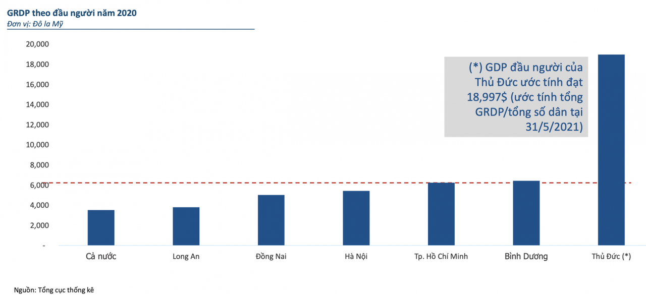Theo báo cáo của Batdongsan.com.vn, hiện TP Thủ Đức đóng góp 1/3 tổng sản phẩm trên địa bàn (GRDP) của TP.HCM, GRDP bình quân đầu người đạt 18,997USD, cao nhất cả nước và gấp 3 lần địa phương xếp thứ 2. TP Thủ Đức cũng được Chính phủ đặt mục tiêu trở thành động lực tăng trưởng mới cho nền kinh tế TP.HCM nói riêng và toàn Việt Nam nói chung. Nếu có những chính sách và định hướng tốt như Thượng Hải và Seoul, TP Thủ Đức có thể tăng trưởng gấp nhiều lần về quy mô dân số cũng như thu nhập của người dân thành phố.