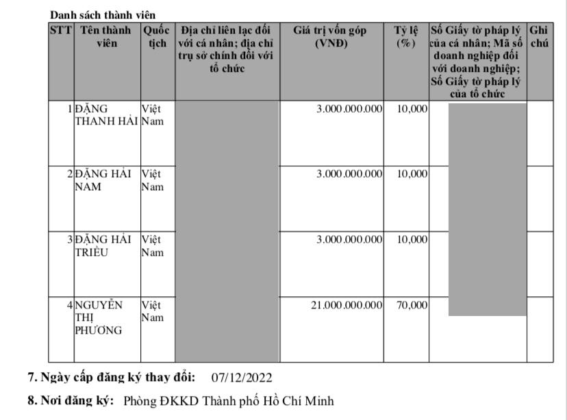 Danh sách thành viên góp vốn gồm có: Đặng Thanh Hải góp 3 tỷ đồng (chiếm tỷ lệ 10%), Đặng Hải Nam góp 3 tỷ đồng (tỷ lệ 10%), Đặng Hải Triều góp 3 tỷ đồng (tỷ lệ 10%) và Nguyễn Thị Phương góp 21 tỷ đồng (tỷ lệ 70%).