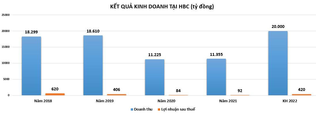 Cụ thể, HBC dự kiến doanh thu năm nay là 20.000 tỷ đồng, lợi nhuận sau thuế 420 tỷ đồng. Con số này cao gần gấp đôi so với doanh thu và gấp 4 lần so với mức lợi nhuận mà Hòa Bình ghi nhận trong năm 2021.
