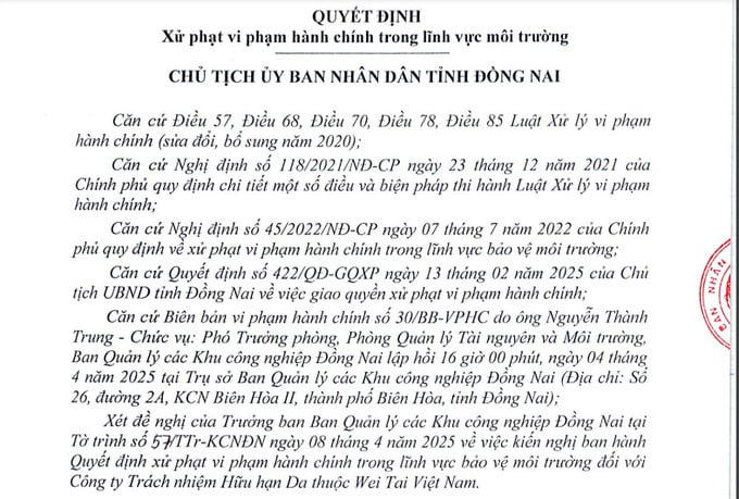 UBND tỉnh Đồng Nai vừa ban hành quyết định xử phạt vi phạm hành chính đối với Công ty TNHH Da thuộc Wei Tai Việt Nam (trụ sở tại Khu công nghiệp Nhơn Trạch III, thị trấn Hiệp Phước, huyện Nhơn Trạch, Đồng Nai) với số tiền 480 triệu đồng vì hành vi vi phạm về môi trường.