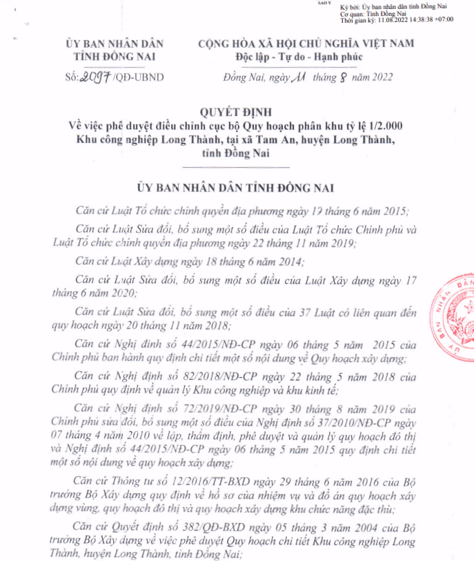 Ngày 11/8, UBND tỉnh Đồng Nai đã có quyết định về việc phê duyệt điều chỉnh cục bộ quy hoạch phân khu tỷ lệ 1/2.000 khu công nghiệp Long Thành, tại xã Tam An, huyện Long Thành do CTCP Sonadezi Long Thành làm chủ đầu tư.