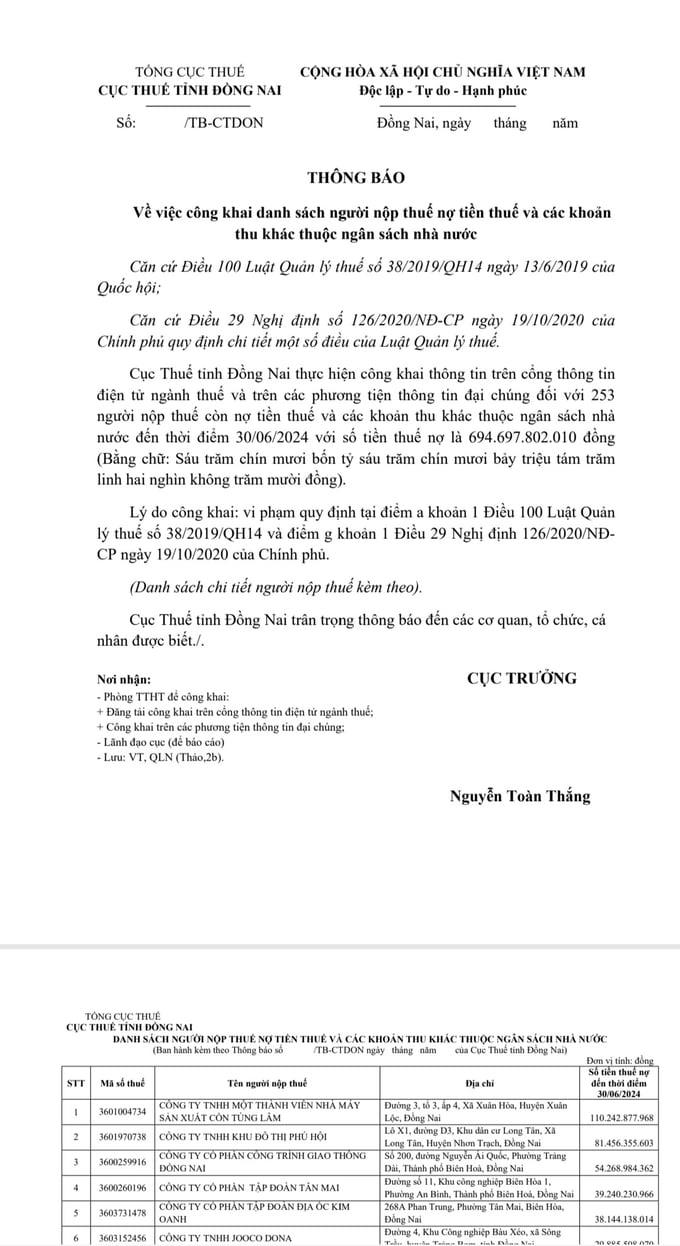 Ngày 15/7, Cục Thuế tỉnh Đồng Nai ban hành Thông báo số 5539/TB-CTDON do Cục trưởng Nguyễn Toàn Thắng ký về việc công khai danh sách người nộp thuế nợ tiền thuế và các khoản thu khác thuộc ngân sách nhà nước.