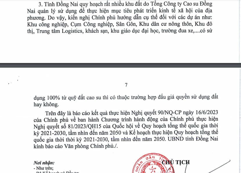 Cũng tại báo cáo này, Đồng Nai cho biết, hiện tỉnh quy hoạch rất nhiều khu đất do Công ty TNHH MTV Tổng công ty Cao su Đồng Nai quản lý sử dụng để thực hiện mục tiêu phát triển kinh tế, xã hội của địa phương.