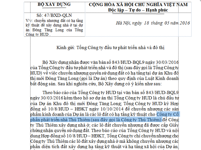 Công văn BXD nêu thời gian Tổng Công ty HUD đã ký Hợp đồng chuyển nhượng 1 phần dự án cho Công ty Cổ phần phát triển nhà Thủ Thiêm.