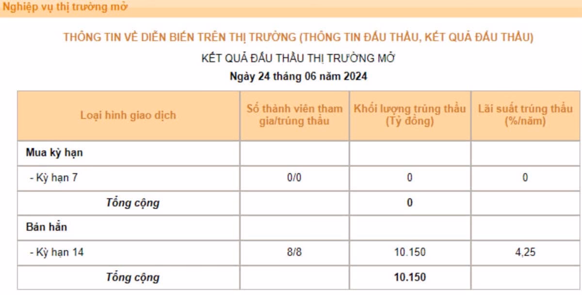 Cụ thể, sau thời gian dài chào bán tín phiếu có kỳ hạn 28 ngày, NHNN đã giảm kỳ hạn tín phiếu xuống còn 14 ngày nhưng lãi suất trúng thầu vẫn được giữ nguyên ở mức 4,25%/năm.