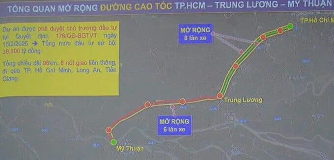 Dự án đầu tư xây dựng mở rộng đường cao tốc TP.HCM - Trung Lương - Mỹ Thuận có tổng mức đầu tư khoảng 39.800 tỷ đồng, với chiều dài 96,13 km.