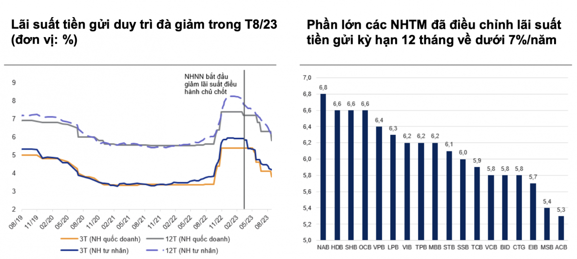 Trong nhóm các ngân hàng tư nhân, lãi suất huy động kỳ hạn 12 tháng giảm mạnh nhất trong tháng 8 tại một số ngân hàng như MSB, STB, EIB, TCB, ACB với mức giảm khoảng 0,8 - 1,2 điểm % so với tháng trước.