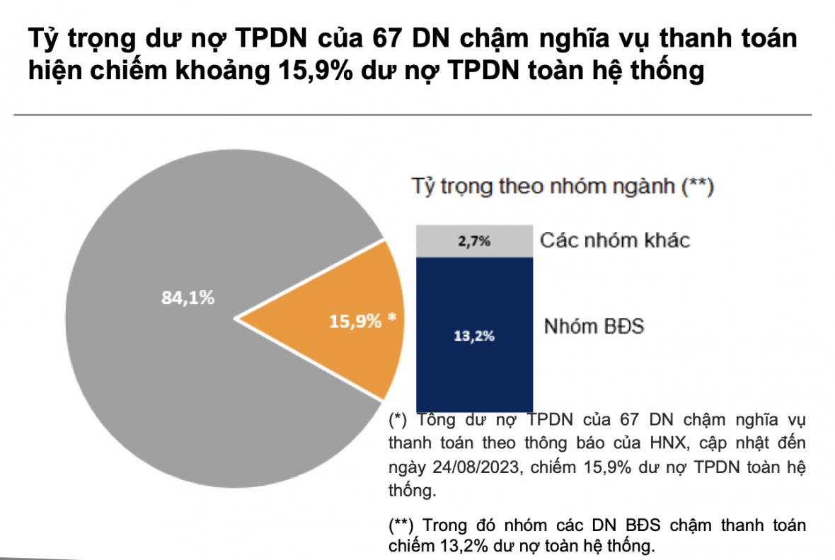 Tính đến ngày 24/8/2023, có khoảng 67 doanh nghiệp nằm trong danh sách chậm nghĩa vụ thanh toán lãi hoặc nợ gốc trái phiếu doanh nghiệp theo thông báo của HNX. Tổng dư nợ trái phiếu doanh nghiệp của các doanh nghiệp này vào khoảng 173.680 tỷ đồng, chiếm khoảng 15,9% dư nợ trái phiếu doanh nghiệp riêng lẻ toàn thị trường. Phần lớn trong số các tổ chức phát hành này là các doanh nghiệp thuộc nhóm bất động sản.
