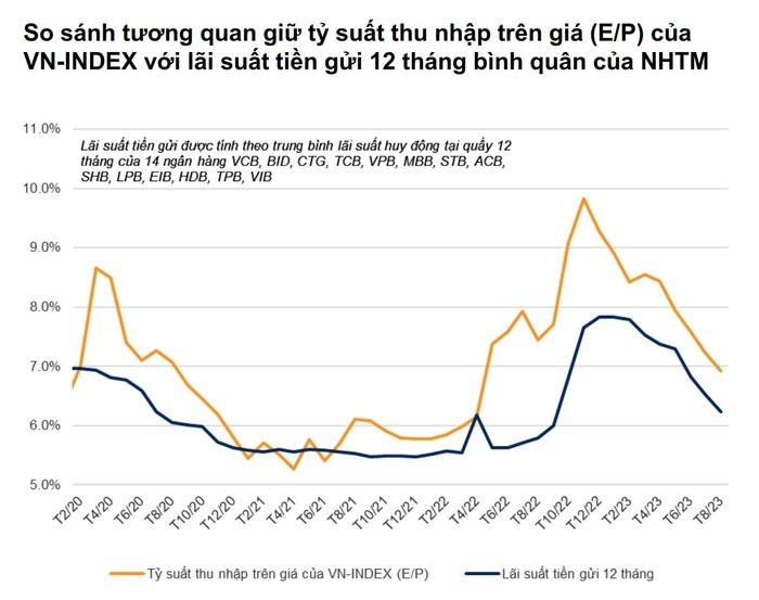 So sánh sức hấp dẫn của thị trường cổ phiếu so với thị trường tiền gửi, VNDIRECT cho hay, tỷ suất thu nhập trên giá (E/P) của VN-Index trung bình trong tháng 8 ở khoảng 6,9%, điều chỉnh nhẹ so với tháng trước (7,2%) do lợi nhuận toàn thị trường chưa phục hồi kịp với đà tăng của VN-Index. Do đó, mặc dù lãi suất huy động 12 tháng trong tháng 8 tiếp tục giảm so với tháng trước (6,2% so với 6,5% trong tháng 7), khoảng cách giữa E/P và lãi suất tiền gửi ngân hàng gần như không đổi so với tháng trước.