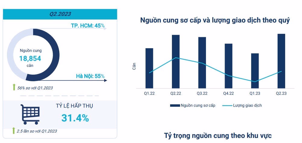 Lượng giao dịch trong quý II/2023 đạt khoảng hơn 700 giao dịch, chiếm 32% tổng nguồn cung và tăng gấp 5 lần quý I. Tuy nhiên lượng giao dịch này vẫn chỉ chiếm khoảng 3% so với cùng kỳ năm trước.