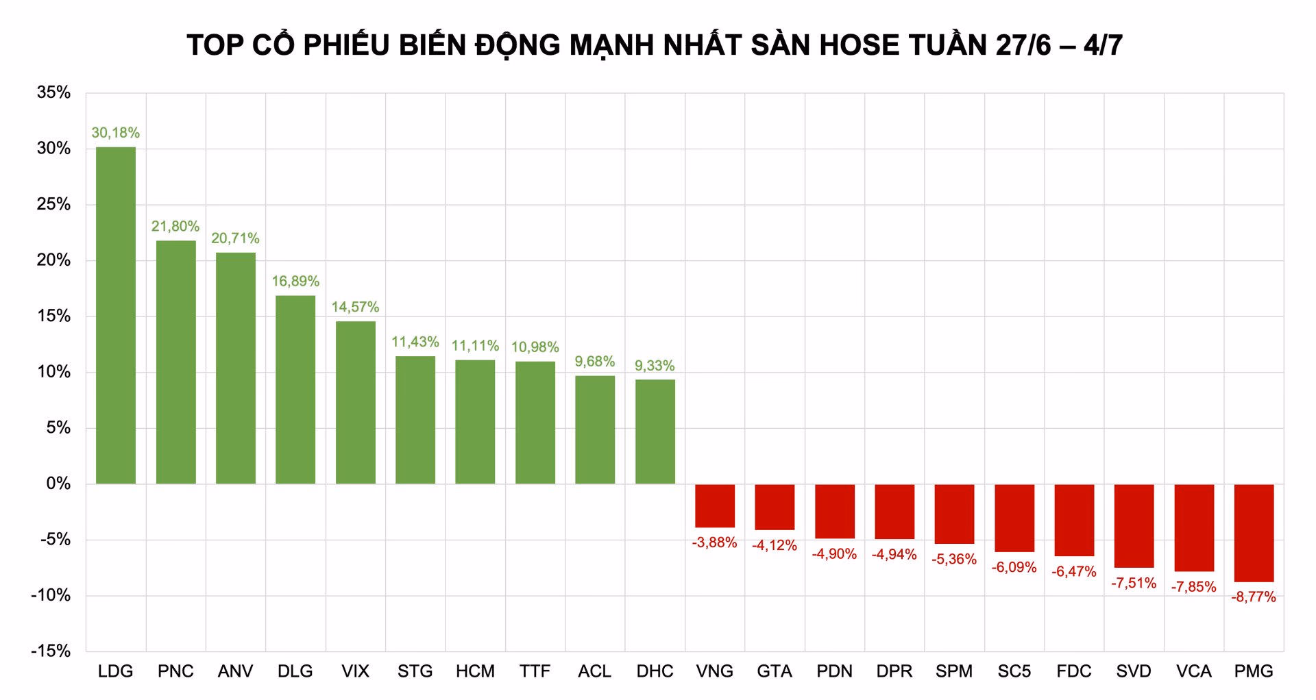 Trên sàn HoSE, tâm điểm chú ý thuộc về các mã midcap và penny với mức tăng giá vượt trội. Dẫn đầu là cổ phiếu LDG của Công ty Cổ phần Đầu tư LDG, tăng tới 30,18% chỉ trong một tuần, với 4 phiên tăng trần liên tiếp – trở thành mã tăng mạnh nhất sàn.