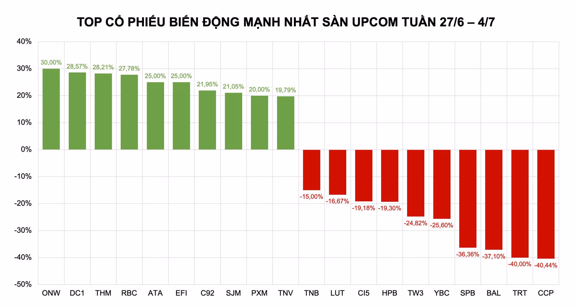 Ở chiều ngược lại, 10 mã giảm sâu nhất lần lượt là CCP (−40,44%), TRT (−40%), BAL (−37,10%), SPB (−36,36%), YBC (−25,60%), TW3 (−24,82%), HPB (−19,30%), CI5 (−19,18%), LUT (−16,67%) và TNB (−15%).