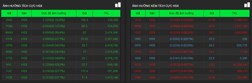 Về diễn biến của thị trường chung, các cổ phiếu trụ cột như SAB, MWG, MBB, ACB… đồng loạt tăng giá mạnh và giúp kéo các chỉ số lên trên mốc tham chiếu. SAB tăng đến 4,9%, MWG tăng 6,6%, HSG tăng 4,3%.