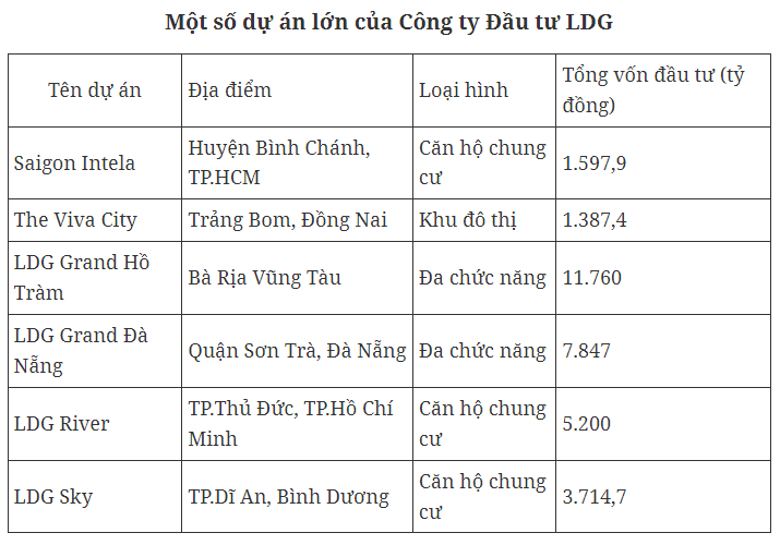 LDG hiện có vốn chủ sở hữu cũng ở mức không nhỏ, với 3.246 tỷ đồng. Tuy nhiên, riêng một dự án đang được công ty thực hiện thủ tục pháp lý là Dự án Khu du lịch nghỉ dưỡng Bình Minh (còn gọi là LDG Hồ Tràm) có vốn đầu tư dự kiến đã lên tới 11.760 tỷ đồng. Chưa kể, công ty cũng còn phải “gánh” nhiều dự án rất lớn khác như Dự án khu du lịch Bãi Bụt - Sơn Trà (Dự án LDG Đà Nẵng) có quy mô vốn lên tới 7.847 tỷ đồng.