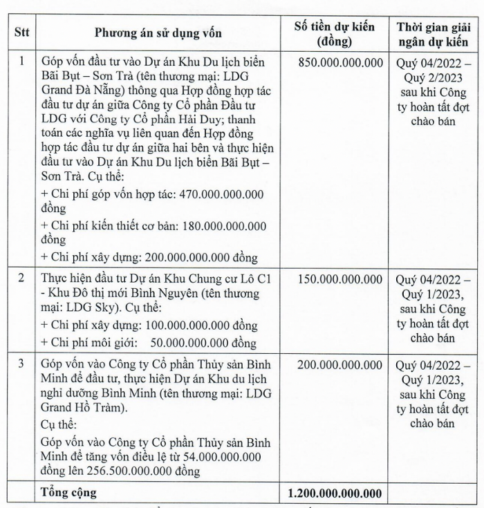 Nếu đợt chào bán diễn ra thành công, LDG dự kiến thu về 1.200 tỷ đồng và dùng vào việc như góp 200 tỷ đồng vào CTCP Thủy sản Bình Minh để đầu tư, thực hiện Dự án Khu du lịch nghỉ dưỡng Bình Minh (tên thương mại: LDG Grand Hồ Tràm).