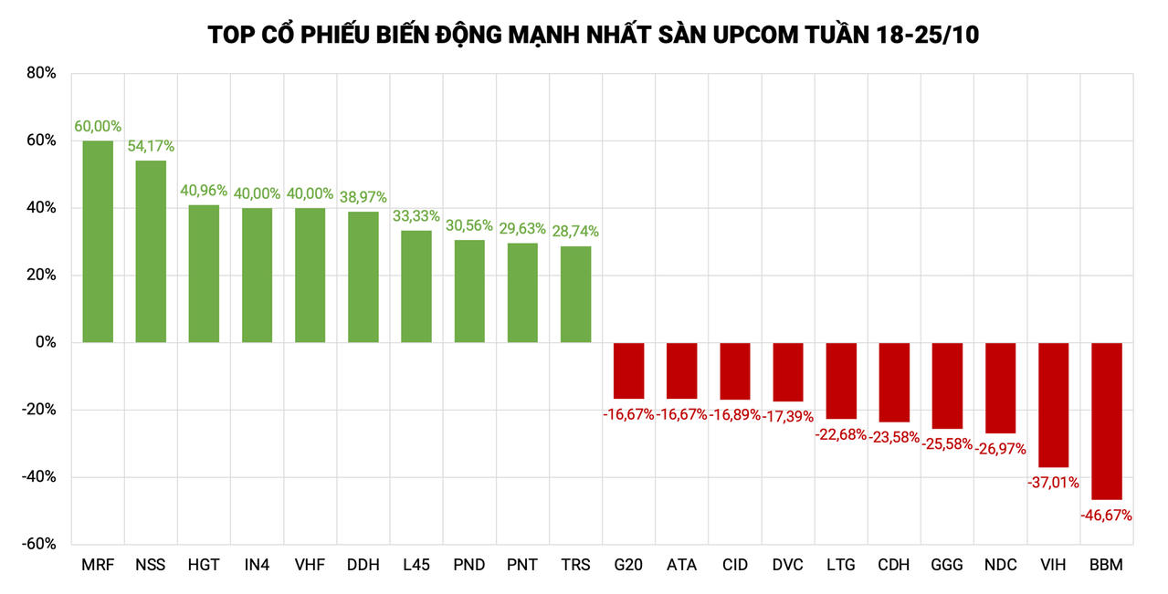 Trên sàn UPCoM, 10 cổ phiếu tăng mạnh nhất là MRF (+60%), NSS (+54,17%), HGT (+40,96%), IN4 (+40%), VHF (+40%), DDH (+38,97%), L45 (+33,33%), PND (+30,65%), PNT (+29,63%), NJC (+29,35%).