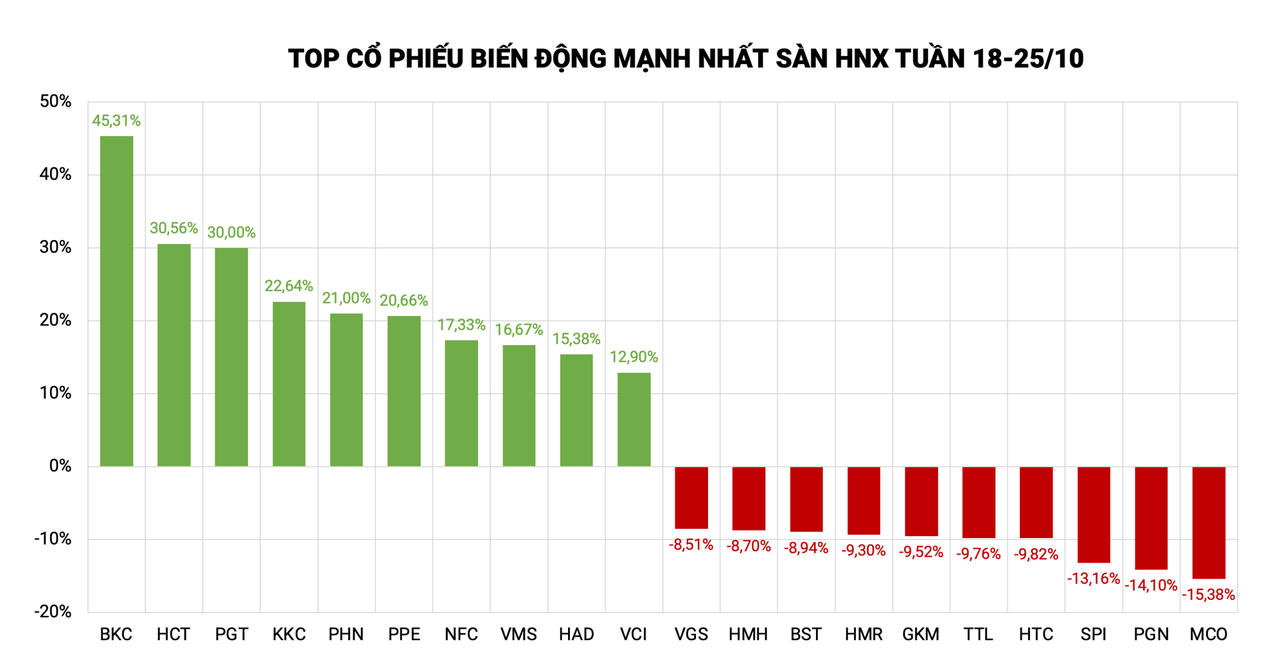 Các cổ phiếu còn lại trong danh sách 10 mã tăng mạnh nhất sàn HNX gồm có: PGT (+30%), KKC (+22,64%), PHN (+21%), PPE (+20,66%), NFC (+17,33%), VMS (+16,67%), HAD (+15,38%), VC1 (+12,9%).