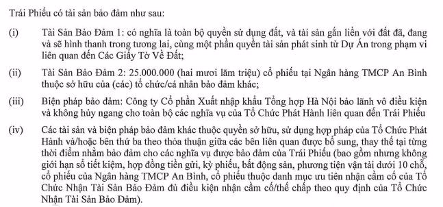 Đáng chú ý, lô trái phiếu 500 tỷ được phát hành vào ngày 31/8/2021 của Vạn Hương cũng được đảm bảo bằng 25 triệu cổ phiếu tại Ngân hàng TMCP An Bình (ABBank). CTCP Xuất nhập khẩu Tổng hợp Hà Nội (Tập đoàn Geleximco) là bên bảo lãnh và Chứng khoán Tiên Phong (TPBS) là bên thu xếp cho Vạn Hương thực hiện đợt huy động vốn này.
