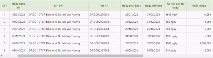 Theo đó, 6 lô trái phiếu lần lượt là DRGCH2124003 phát hành ngày 1/9/2021 mệnh giá 1.000 tỷ đồng, đáo hạn 3 năm; DRGCH2126001 phát hành ngày 29/9/2021 mệnh giá 400 tỷ đồng, với thời hạn 1568 ngày; DRGCH2124004 phát hành ngày 25/10/2021 mệnh giá 500 tỷ đồng, với thời hạn 864 ngày; DRGCH2123005 phát hành ngày 31/12/2021 mệnh giá gần 1.500 tỷ đồng thời hạn 565 ngày; DRGCH2226001 phát hành ngày 26/1/2022 mệnh giá 1.195 tỷ đồng thời hạn 1539 ngày.
