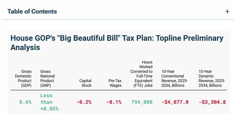 Vị chuyên gia dẫn lại phân tích sơ bộ của Tax Foundation cho thấy, mặc dù dự luật One “Big Beautiful Bill Act” có thể tạo ra 794.000 việc làm và tăng GDP khoảng 0,6%, nhưng sẽ làm gia tăng thâm hụt ngân sách từ 3.305 đến 4.077 tỷ USD trong 10 năm tới, tùy theo cách tính.
