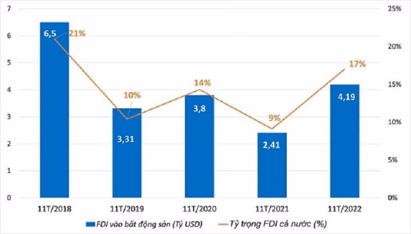 Cụ thể, Theo số liệu của Cục Đầu tư nước ngoài (Bộ Kế hoạch và Đầu tư), tính đến ngày 20/11, tổng vốn đầu tư trực tiếp nước ngoài (FDI) đăng ký vào Việt Nam đạt 25,1 tỷ USD, giảm 5% so với cùng kỳ năm 2021. Trong đó, kinh doanh bất động sản tiếp tục đứng thứ 2 về thu hút vốn đầu tư FDI trong 11 tháng qua với gần 4,19 tỷ USD, chiếm gần 17% tổng vốn đầu tư đăng ký. Cùng kỳ năm ngoái, con số này là 2,41 tỷ USD.