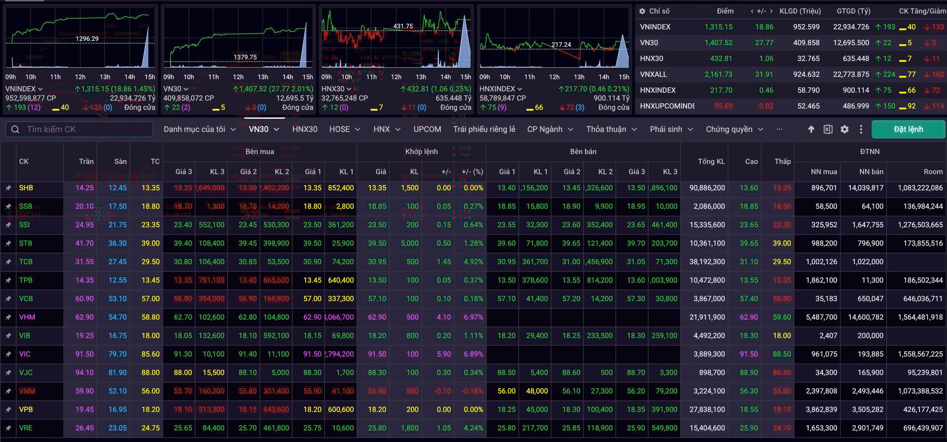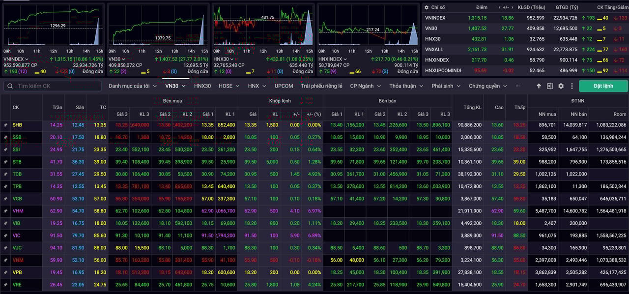 Bên cạnh VIC và VHM, cổ phiếu VRE cũng ghi nhận mức tăng đáng kể, đóng cửa cao hơn giá tham chiếu gần 5%. Các mã như TCB, BVH, GVR, MWG tăng từ 1,5% đến 4,5%, góp phần củng cố đà đi lên của thị trường. Ngược lại, VNM, GAS và PLX là ba cổ phiếu duy nhất trong VN30 giảm điểm, song mức giảm đều dưới 1%, không ảnh hưởng nhiều đến xu hướng chung.