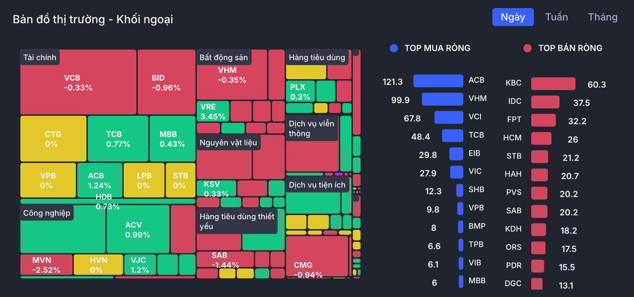 Về giao dịch khối ngoại, nhà đầu tư nước ngoài tiếp tục mua ròng trong phiên sáng nay, với giá trị gần 139 tỷ đồng. ACB, VHM, TCB và VCI là những cổ phiếu được mua vào nhiều nhất. Ở chiều ngược lại, các cổ phiếu như KBC, FPT, HCM và DGC vẫn nằm trong danh sách bị bán ròng.
