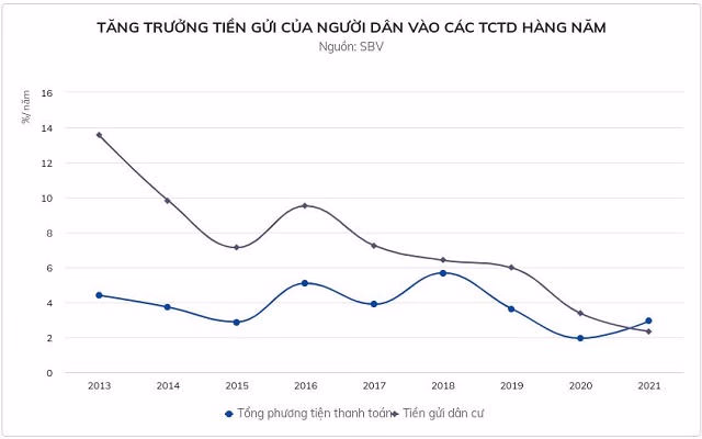 Giai đoạn 2010-2014, tăng trưởng tiền gửi của dân cư tại hệ thống các tổ chức tín dụng những tháng đầu năm đều đạt trên dưới 10%. Trong đó, mức tăng 4 tháng đầu năm 2013 lên tới 13,55%. Tuy nhiên, tốc độ này đã chậm lại rõ rệt kể từ năm 2016, và giảm mạnh từ năm 2020 đến nay. Tính trong cả năm, tăng trưởng tiền gửi của dân cư năm 2016 là 17,4%, nhưng đến năm gần nhất (2020) đã giảm chỉ còn 6,46%.