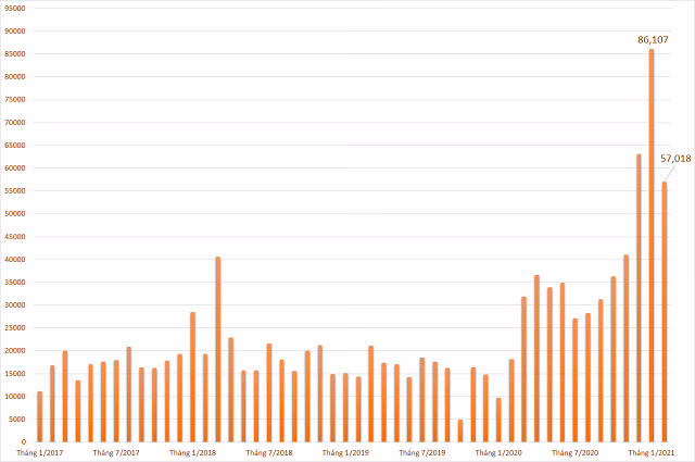 Số lượng tài khoản nhà đầu tư cá nhân trong nước mở mới trong tháng 2 giảm đáng kể so với tháng 1 và ở mức 57.018 tài khoản, giảm 33,8%. Tuy vậy, lượng mở mới này vẫn cao thứ 3 lịch sử chỉ sau tháng 1 (86.017 tài khoản) và tháng 12/2020 (63.075 tài khoản).