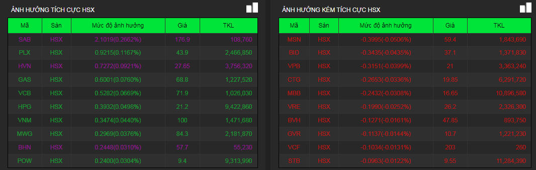 Các cổ phiếu như SAB, PLX, HVN, VCB, HPG… tác động tích cực nhất đến chỉ số chính VN-Index trong phiên ngày 20/4. Trong đó, SAB được kéo lên mức giá trần và khớp lệnh hơn 100.000 đơn vị. PLX tăng đến 6% lên 43.900 đồng/cp. Các cổ phiếu dầu khí như PVB, PVD, PVS… đồng loạt bứt phá bất chấp giá dầu thế giới giảm. PVB và PVD đều được kéo lên mức giá trần.