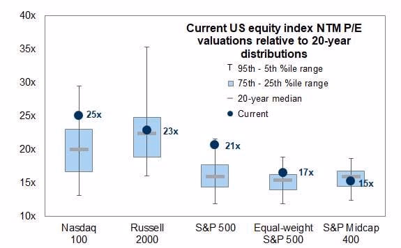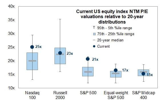 Điểm đáng chú ý là chỉ số Equal-weight S&P500 – đại diện cho hiệu suất trung bình của tất cả cổ phiếu trong chỉ số S&P500, không bị chi phối bởi nhóm vốn hóa lớn – đang giao dịch quanh mức P/E 17 lần.