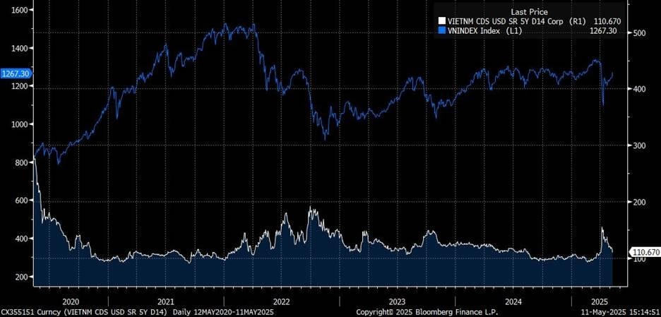 Tại thị trường trong nước, bức tranh kinh tế – tài chính đang xuất hiện những gam màu sáng hơn. Một trong những tín hiệu tích cực nhất là chỉ số CDS (Credit Default Swap) kỳ hạn 5 năm của Việt Nam – thước đo mức độ rủi ro tín dụng quốc gia – đã hạ nhiệt sau khi tăng vọt lên mức 150 điểm vào đầu tháng 4, thời điểm xuất hiện lo ngại về tác động từ chính sách thuế quan của Mỹ.