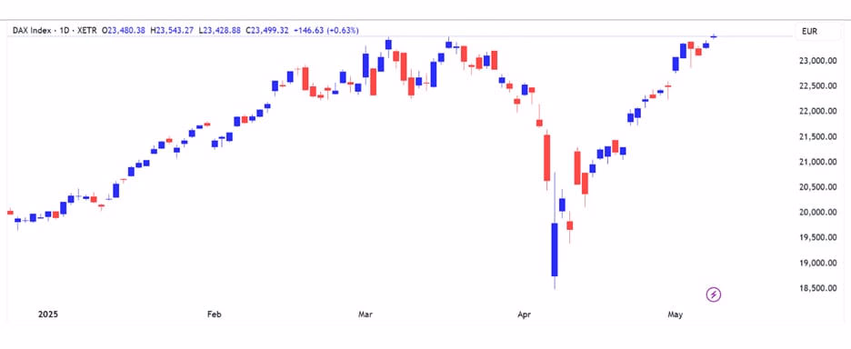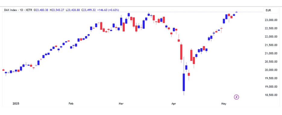 Trái ngược với nhịp điều chỉnh tại Mỹ, chứng khoán châu Âu ghi nhận mức tăng ấn tượng trong tuần. Nổi bật nhất là chỉ số DAX của Đức – đại diện cho nền kinh tế đầu tàu của khu vực – đã xác lập mức đỉnh lịch sử mới.