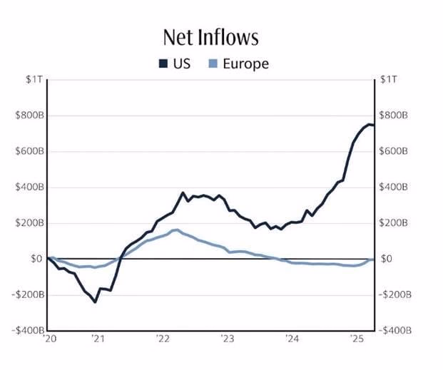Theo ông Nguyễn Thế Minh, dòng vốn đầu tư toàn cầu cũng bắt đầu ghi nhận dấu hiệu đảo chiều khi rút ròng khỏi thị trường chứng khoán Mỹ và quay lại các thị trường châu Âu, nơi được đánh giá đang phục hồi vững chắc sau giai đoạn kiểm soát thành công lạm phát.