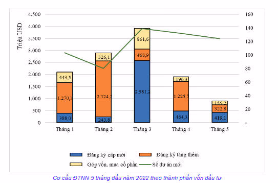 Tính đến 20/5/2022, tổng vốn đăng ký cấp mới, điều chỉnh và góp vốn mua cổ phần, mua phần vốn góp (GVMCP) của nhà ĐTNN đạt trên 11,71 tỷ USD, bằng 83,7% so với cùng kỳ năm 2021. Trong đó, tuy vốn đăng ký mới giảm 53,4%, nhưng vốn điều chỉnh và GVMCP tăng mạnh lần lượt là 45,4% và 51,6%. Vốn thực hiện của dự án đầu tư nước ngoài ước đạt 7,71 tỷ USD, tăng 7,8% so với cùng kỳ năm 2021.