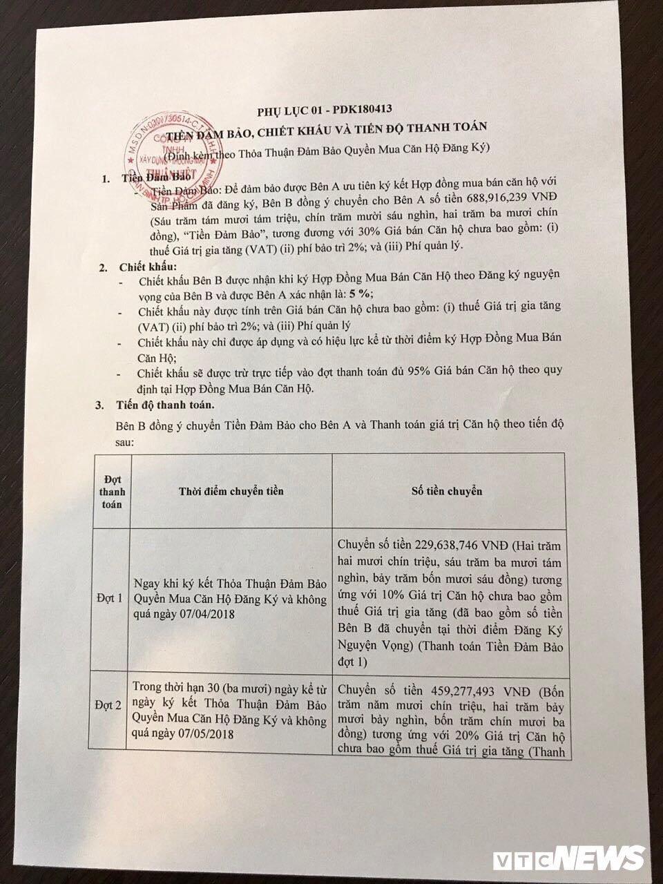 Theo ông H., gia đình ông đã đóng 100 triệu đồng tiền cọc và 230 triệu đồng tiền tiến độ đợt 1, đầu tháng 5 sẽ đóng tiếp 450 triệu tiền tiến độ đợt 2. Cứ thế, sau 6 đợt thì hoàn tất số tiền mua căn hộ.