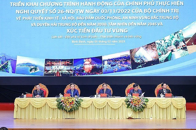 Với chủ đề "Liên kết - Đột phá từ kinh tế biển - Phát triển nhanh và bền vững", Hội nghị triển khai Chương trình hành động của Chính phủ thực hiện Nghị quyết số 26-NQ/TW ngày 03/11/2022 của Bộ Chính trị về phương hướng phát triển kinh tế - xã hội và bảo đảm quốc phòng, an ninh Vùng Bắc Trung Bộ và Duyên hải Trung Bộ đến năm 2030, tầm nhìn đến năm 2045 và xúc tiến đầu tư vùng đã được tổ chức ngày 5/2 tại Quy Nhơn, tỉnh Bình Định. Đây là hội nghị "3 trong 1" với 3 nội dung chính: Triển lãm thành tựu phát triển kinh tế - xã hội và giới thiệu nông sản đặc trưng của Vùng; công bố, triển khai Chương trình hành động của Chính phủ thực hiện Nghị quyết 26 của Bộ Chính trị; xúc tiến đầu tư Vùng Bắc Trung Bộ và Duyên hải Trung Bộ.