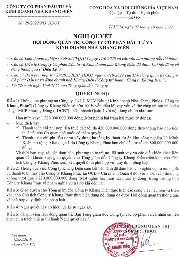 Trong một diễn biến khác, Nhà Khang Điền cho biết sẽ bảo lãnh vay vốn cho Công ty TNHH MTV Đầu tư Kinh doanh Nhà Khang Phúc (công ty con) vay vốn và thế chấp tài sản tại Ngân hàng TMCP Phương Đông (OCB).