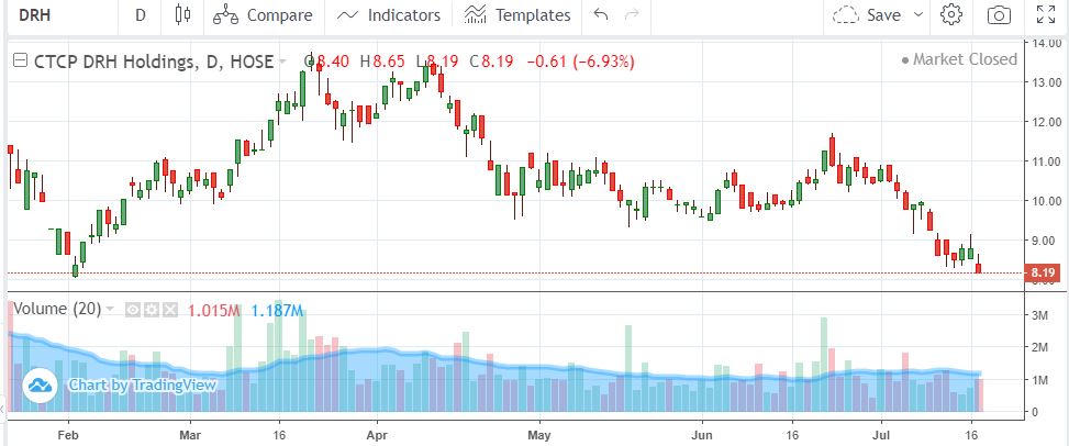 Trên thị trường chứng khoán, kể từ đầu tháng 7/2021 đến nay, giá cổ phiếu DRH lao dốc mạnh. Kết phiên giao dịch ngày 19/7, giá cổ phiếu DRH giảm sàn gần 7% xuống còn 8.190 đồng/cp (giảm gần 32% so với đầu tháng 7).