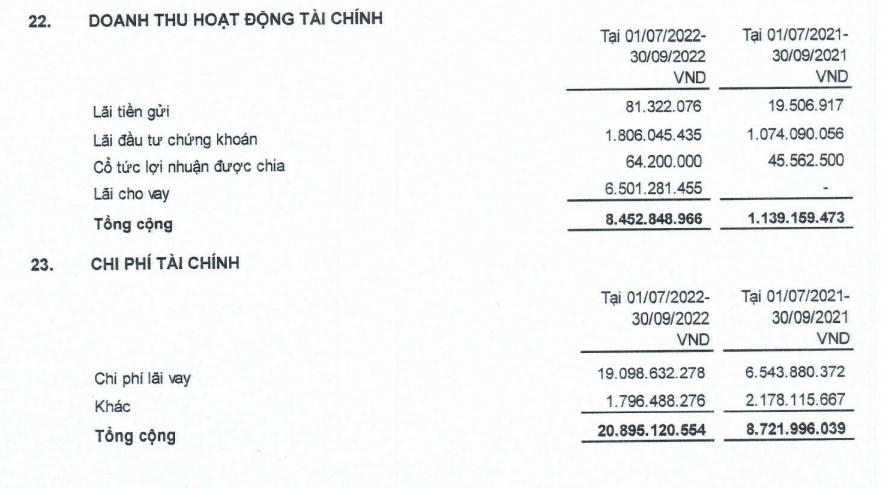 Trong kỳ, doanh thu tài chính tăng mạnh từ 1,2 tỷ đồng lên 8,5 tỷ đồng, trong đó chủ yếu là chi phí từ lãi cho vay (6,5 tỷ đồng) và lãi đầu tư chứng khoán (1,8 tỷ đồng). Tuy nhiên chi phí tài chính cũng tăng đột biến từ 8,7 tỷ đồng lên 21 tỷ đồng, trong đó chủ yếu là chi phí lãi vay (19,1 tỷ đồng).