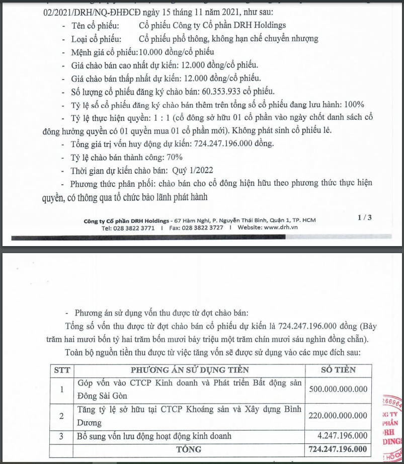 Trước đó, nhằm bù đắp dòng tiền, DRH Holdings cũng đã thông qua phương án phát hành 60 triệu cổ phiếu ra công chúng theo tỷ lệ 1:1, giá chào bán là 12.000 đồng/cổ phiếu. Qua đó, vốn điều lệ của DRH tăng từ 610 tỷ đồng lên khoảng 1.213 tỷ đồng. Về kế hoạch sử dụng vốn, donh nghiệp sử dụng 500 tỷ đồng góp vốn vào CTCP Kinh doanh và phát triển bất động sản Đông Sài Gòn, 200 tỷ đồng để tăng tỷ lệ sở hữu tại Công ty Cổ phần Khoáng sản và Xây dựng Bình Dương - Bimico. Số tiền còn lại cho bổ sung vốn lưu động.