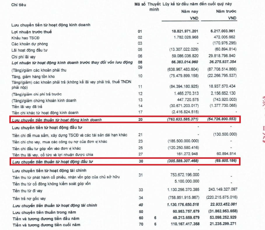 Trong khi đó, dòng tiền đầu tư của công ty cũng đáng báo động khi âm đến 305,6 tỷ đồng sau 9 tháng, tăng 77% so với cùng kỳ.