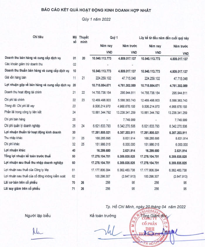 Kết thúc quý I/2022, DRH Holdings thu được doanh thu thuần 10,9 tỷ đồng, tăng 127% so với cùng kỳ năm ngoái (4.8 tỷ đồng). Sau khi trừ các khoản giá vốn và chi phí, lợi nhuận trước và sau thuế của công ty đều đạt 17,3 tỷ đồng, tăng 170%, tương đương thực hiện được 17,3% kế hoạch lợi nhuận năm 2022.