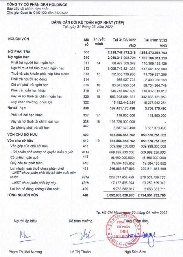 Về tình hình kinh doanh của DRH, tại thời điểm quý I/2022, tổng nợ phải trả là 2.217 tỷ đồng, trong đó, vay nợ tài chính gần 847 tỷ đồng, cao gấp đôi so với đầu năm và xấp xỉ vốn chủ sở hữu doanh nghiệp gần 876 tỷ đồng.
